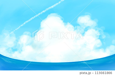 海上に沸き立つ入道雲と飛行機雲のリアルな水彩背景イラスト