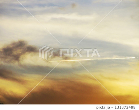 朝焼け雲の中を飛ぶジェット旅客機と飛行機雲
