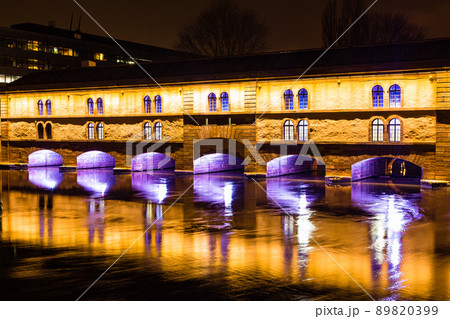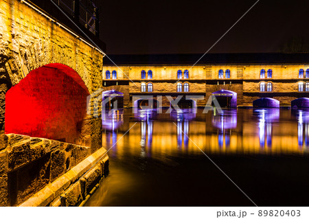 フランス ストラスブールの夜になってライトアップされたポン・クヴェール橋とヴォーバン・ダム