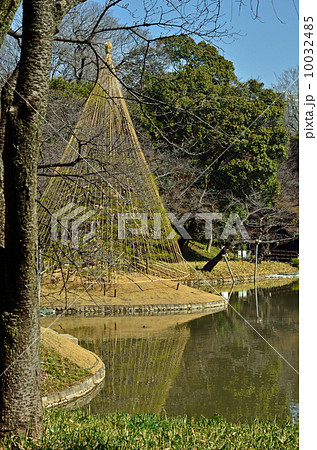 雪吊り準備中の松と色鮮やかな紅葉が水面に映り込む秋の庭園 (東京都、文京区、小石川後楽園)