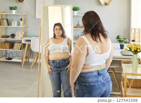 Unhappy plus size woman looking at her reflection in mirror