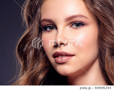 Beautiful brown-hair girl with long hair. Close up of a pretty caucasian girl smiling at camera.