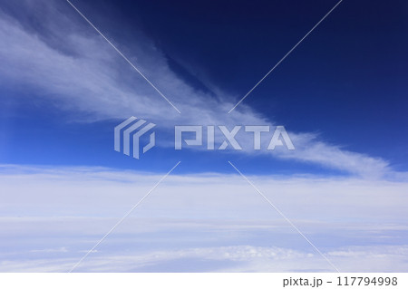 自然 気象 雲、高度一万メートルの飛行機から見た雲。上から順に巻雲、巻層雲、高積雲かな?
