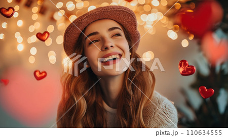 Portrait of happy young woman celebrating Valentine`s Day, adult girl having fun with small heart shapes on bokeh lights background. Concept of love, party, people, design