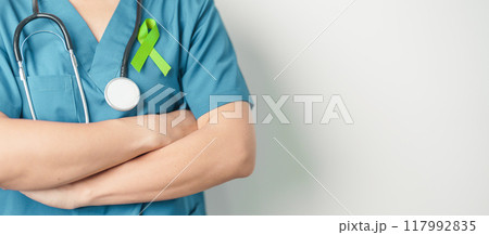 Doctor with green Ribbon for world Lymphoma Awareness September month, world Mental Health Day, Liver, Gallbladders, bile duct, cervical, kidney Cancer. Healthcare and world cancer day concept