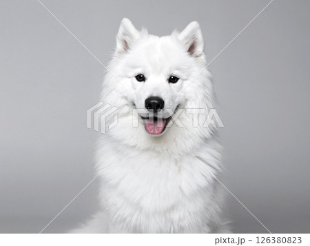 Collage made of portrait of funny, curious white Siberian Husky, Samoyed dog posing against grey studio background.