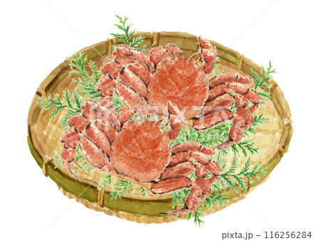水彩で描いたヒバを敷いたザルに盛った毛蟹の水彩画【手描き】白バック 透過背景