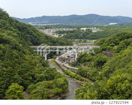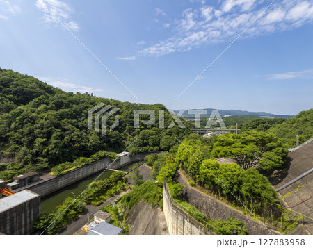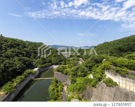 兵庫 川西市 一庫ダム上から見た放水口と住宅地(春)