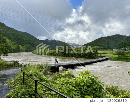 濁流の沈下橋を歩く人