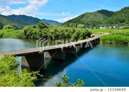 四万十川に架かる一斗俵沈下橋 新緑 (高知県 四万十町)