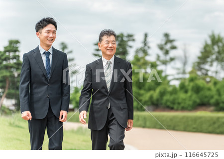 公園を歩く若いビジネスマンとシニア世代の男性ビジネスマン