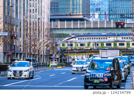 日本の東京都市景観 大手町駅前の交差点や新幹線、客待ちをするタクシーなどを望む。奥に日本橋再開発…