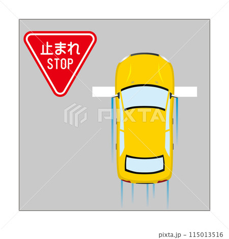 止まれの標識で、一時停する自動車のイラスト