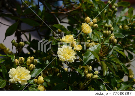 春の陽ざしを受けて輝く、庭に咲いた満開のモッコウバラ