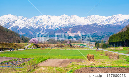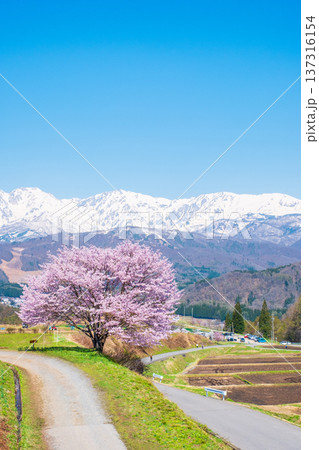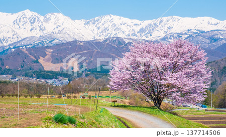 野平の一本桜と北アルプスの風景