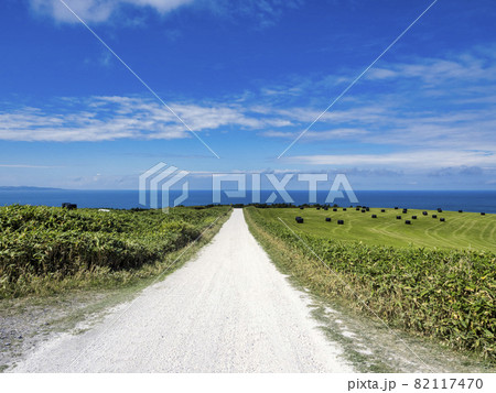 北海道宗谷丘陵の貝殻で出来た白い道から利尻富士を望む