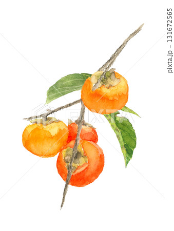 水彩で描いた葉枝付き柿の実のイラスト素材【手描き】白バック 切り抜き コピースペースあり