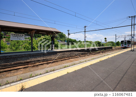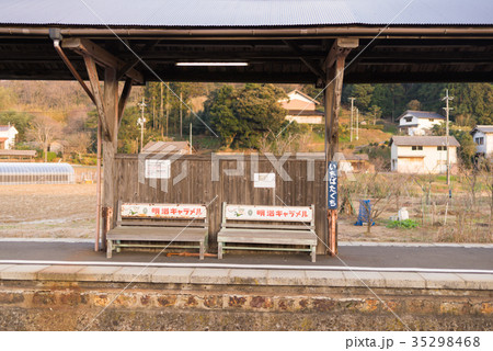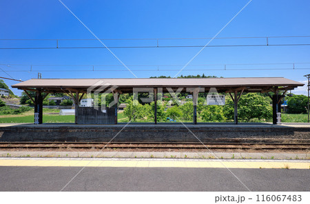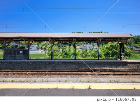 一畑口駅のレトロな木造のホームと青空の風景 ... 島根県 出雲市(晴れ)