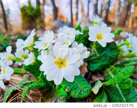 White primrose close-up. First spring flowers in the forest.