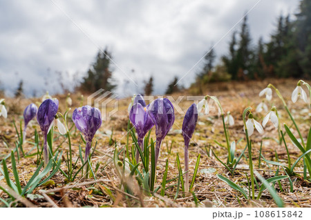Spring purple crocus. Autumn mountains flowers in