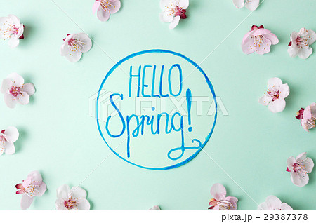 Hello spring note with cherry blossom flowers