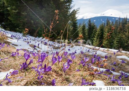 Beautiful spring landscape with snow and saffron flowers