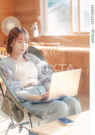 海を背景にスマホを構える20代女性。旅先で思い出を切り取るエモーショナルな時間