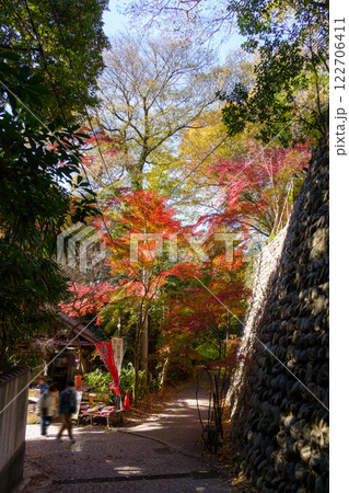 深大寺 一福茶屋の横の参道 冬晴れの青空と紅葉 東京都調布市深大寺元町
