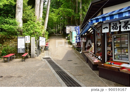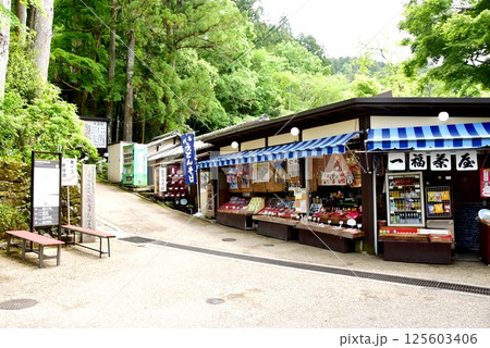 京都市 大原三千院御殿門前参道(大原女の小径)と新緑と一福茶屋