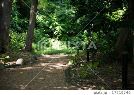 薄暗い森の中の木々に遮られ逆光の光で撮った風景