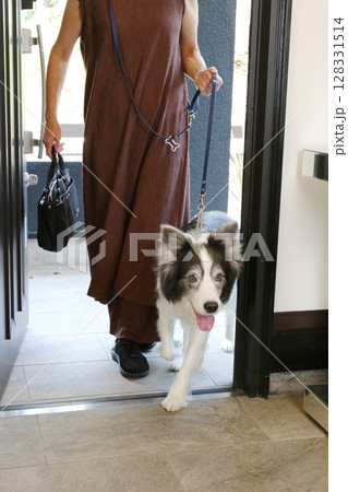 お散歩から帰ってきた飼い主とボーダーコリー