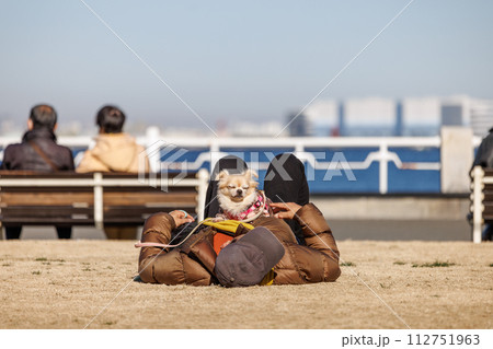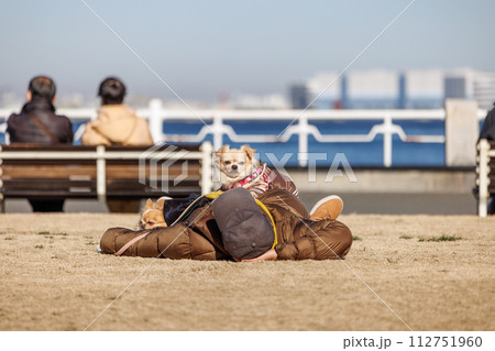 冬の暖かい日に公園の芝生の上で昼寝をする人と愛犬