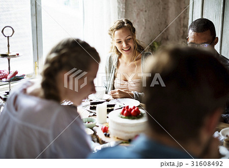 Friends Gathering Together on Tea Party Eating Cakes Enjoyment happiness