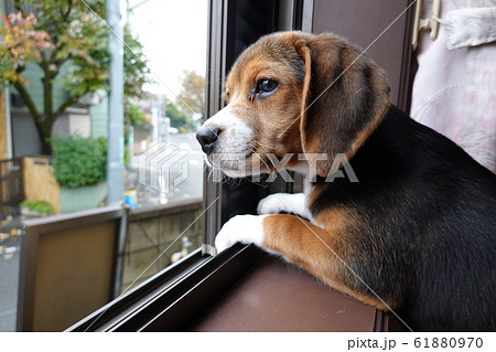 犬 中型犬 子犬 ビーグル 室内 家庭犬 窓辺 見送り