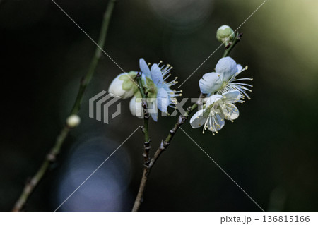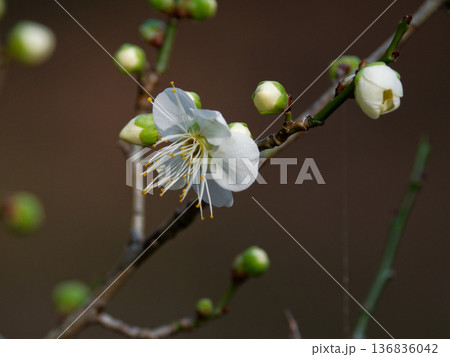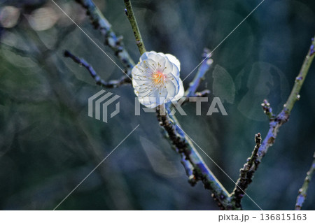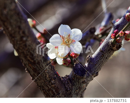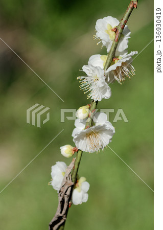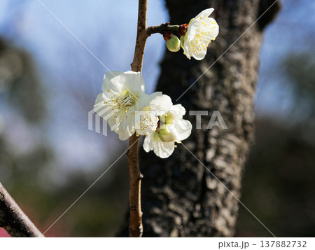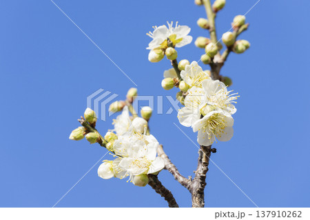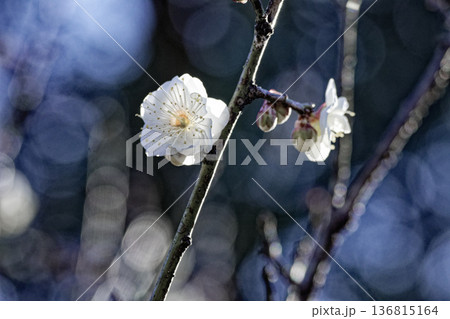 冬の日差しを浴びた白梅の一重の花(白い花とつぼみをつけた梅の枝)