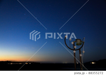 宮崎県日南市池ケ山から七つ岩と並ぶ小場島の上に広がる星空に横に流れる天の川と灯台と共に海を照らす金星