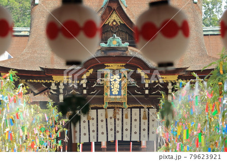 京都、北野天満宮の三光門の参道脇に飾られた七夕の短冊と御手洗祭の提灯