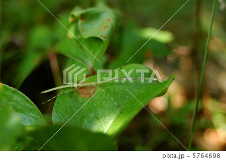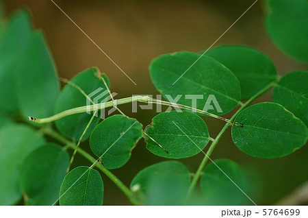 ヤマブキの花に止まるナナフシモドキの幼虫