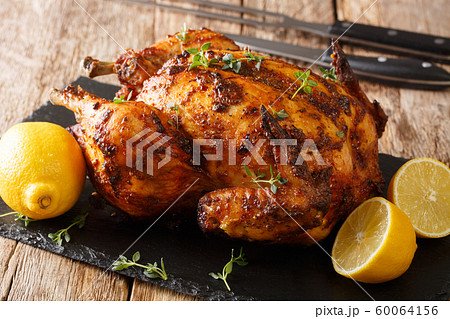 Tasty aromatic rotisserie chicken with thyme,