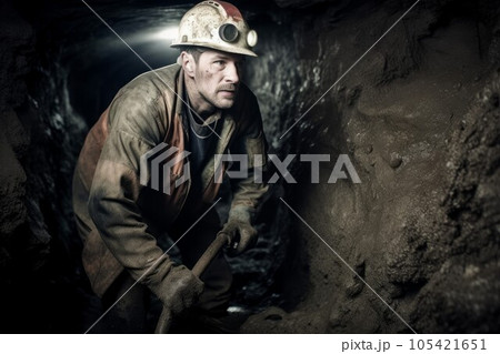 Miner digging mine drill. Worker gold. Fictional person. Generate Ai