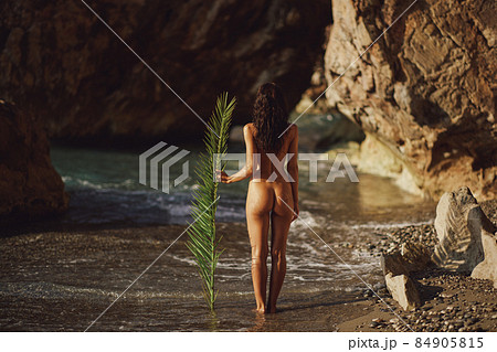 Undressed Beach Female Model on Rocky Deserted Seashore During Beach Relax