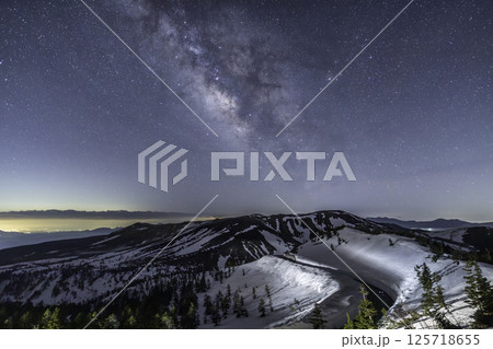 春の渋峠から雪の回廊と草津白根山に昇る天の川