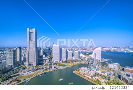 日本の横浜都市景観 総帆展帆の日本丸やランドマークタワー、六本木、麻布台、スカイツリーなどを望む