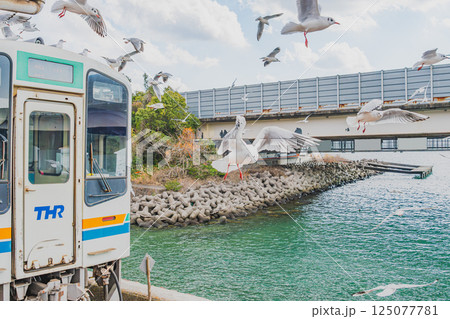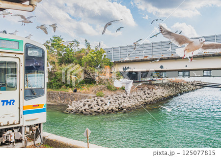浜松市にある天竜浜名湖鉄道の浜名湖佐久米駅で飛び交うカモメたちと電車の風景(静岡県)