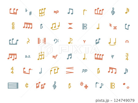 線の編集が可能なベクターデータ。漫画にも使える、手描きのいろいろな音符記号のカラフルなアイコンセット