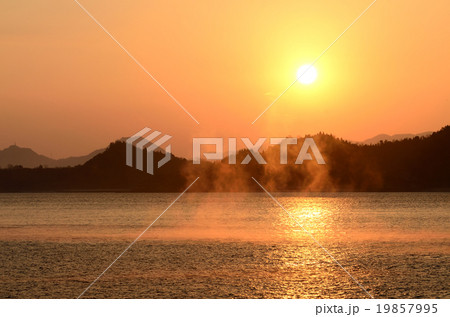 海霧流れる瀬戸内の朝焼け