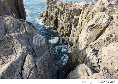 越前海岸 東尋坊の大池(入り江)と観光遊覧船