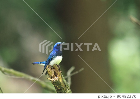 涼しい森林の止まり木に綺麗な鳴き声のオオルリが止まる
