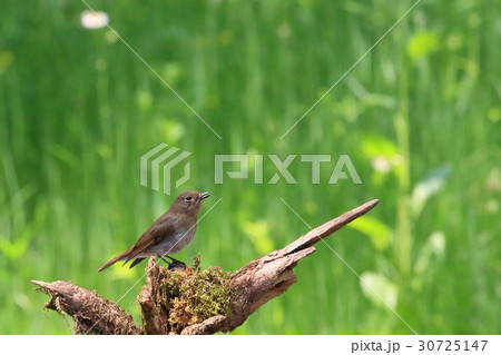 巣材の苔を運ぶ営巣中のオオルリの雌鳥