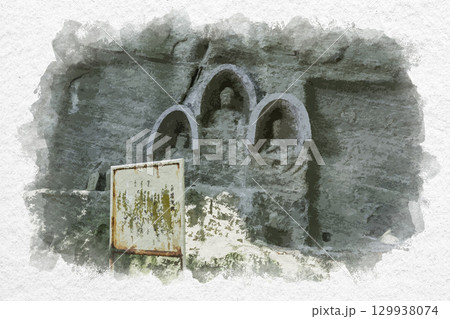 水彩画風 四国八十八箇所75番 弥谷寺 弥陀三尊磨崖仏 香川県三豊市